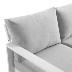 - Amply padded back and seat cushions are upholstered with UV resistant fabric in an elegant grey colour to coordinate the white frame.