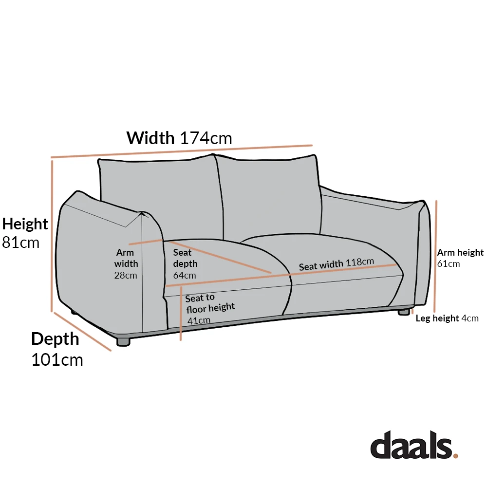 - Two seater sofa size:Â W 174Â x DÂ 101 x HÂ 81 cm.Â