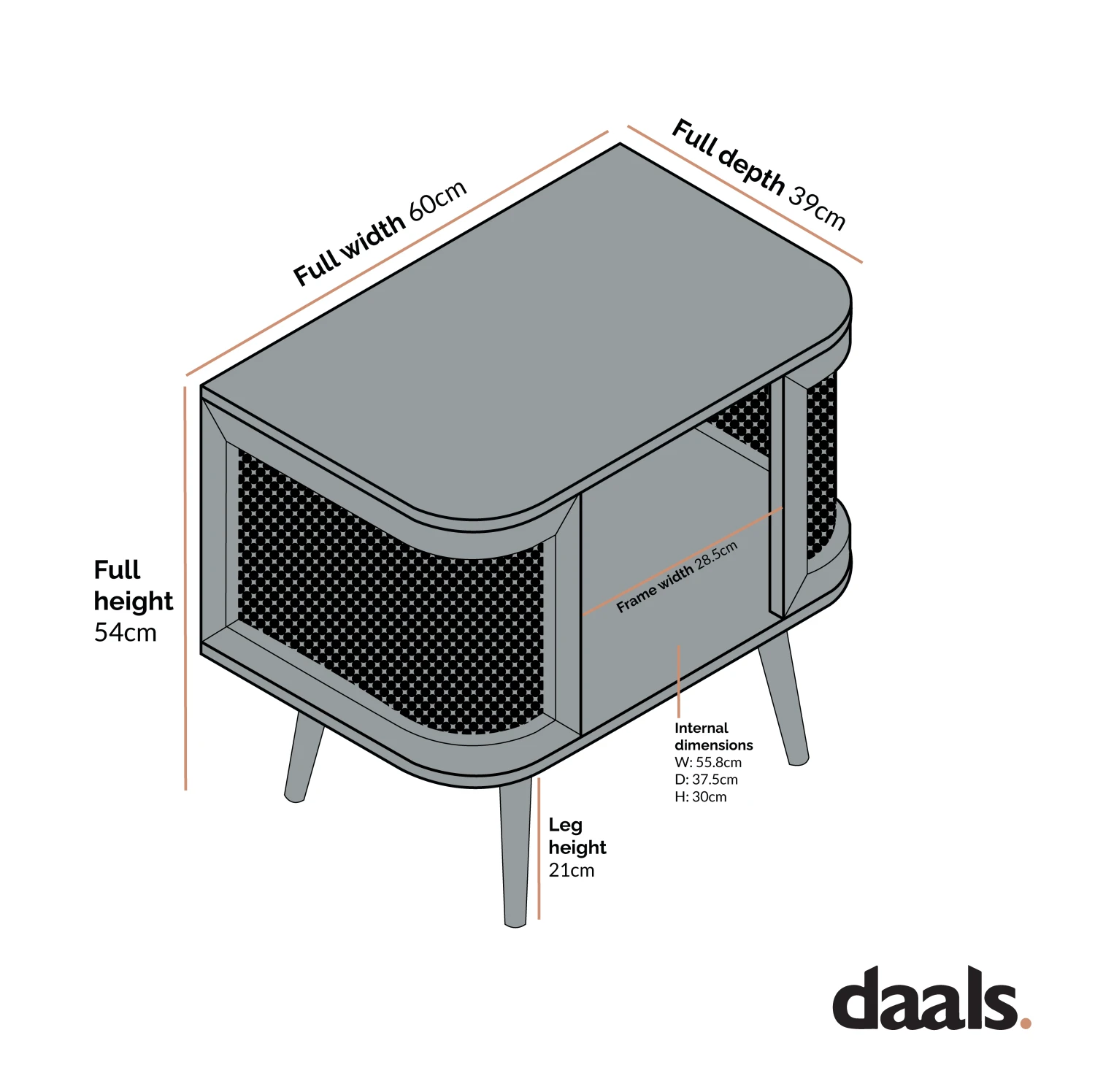 - Complete the look:Â Pictured with our Izzy Curved Rattan Bedside Table is our Constance Winged Headboard Ottoman Bed in Beige Linen